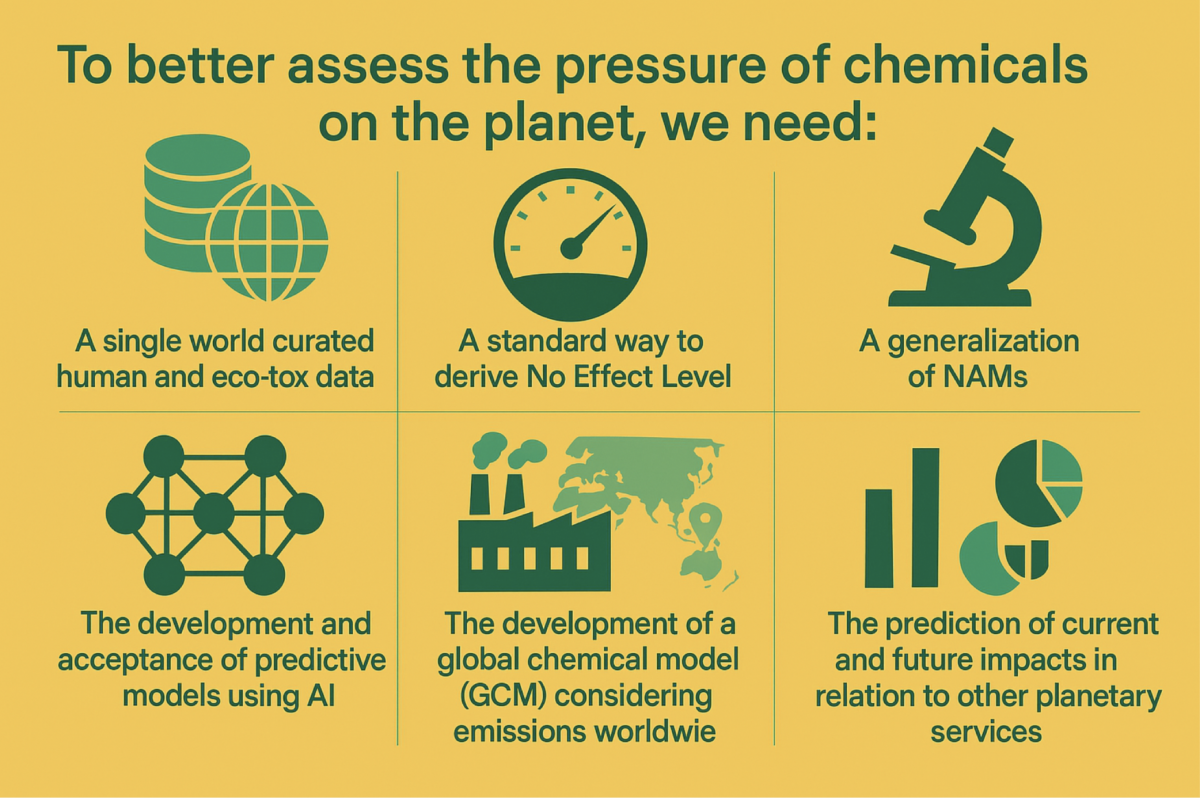 •Firstly, robust predictive models that can estimate the potential impacts of chemical substances on health and the environment. It is unrealistic and impossible to generate this data solely through experimental means, given the considerable volume of existing substances. We need the generalisation of NAM to conduct Risk Assessment, LCA and SSbD. We also need to develop predictive toxicity using artificial intelligence.•Secondly, we need a global model capable ofconsideringall uses and releases of these substances on a worldwide scale. This model should include historical data since the 1950s, as well as projections up to 2050, to accurately assess exposure levels in our ecosystems and their consequences.